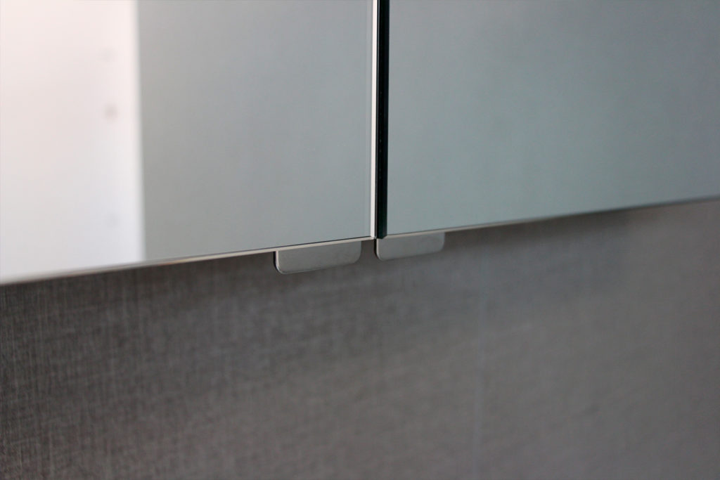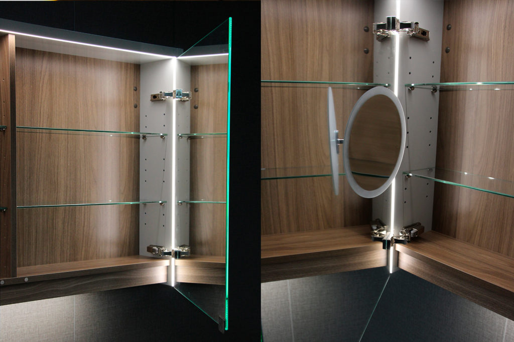 Innenausstattung Dekor Nussbaum gebleicht/verchromte Griffe/6 mobile Glasfachböden/LED Beleuchtung seitlich sowie oberhalb und unterhalb des Schrankes/Dimmer und Sensorschalter unter dem Schrank/Steckdose. Die starken Seiten von Bella Luxe: Spiegelschrank dreitürig I doppelt verspiegelt I Magnetstreifen für kleine Accessoires I Vergrösserungsspiegel