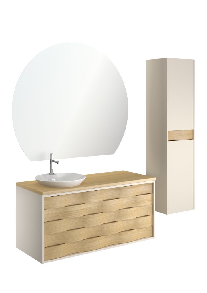 Die Möbelelemente basieren auf MDF-Platten mit lackiertem Natureichenfurnier, FSC®-PEFC-zertifiziert; Pflegeleicht und langlebig, da feuchtigkeitsbeständig.