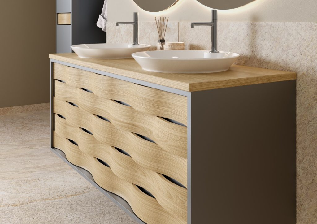 Die Nähe zwischen Holz und Wasser ermöglicht es uns, uns wieder mit unserer tiefen Natur und unseren Emotionen zu verbinden. Die wellenförmige Linie der Cascade-Eiche bietet sich als freudige Ode an unsere Sinne für eine schwebende Zeit der Ausgeglichenheit und Wollust an Wohlbefinden, aus dem man Kraft und Gelassenheit schöpfen kann.