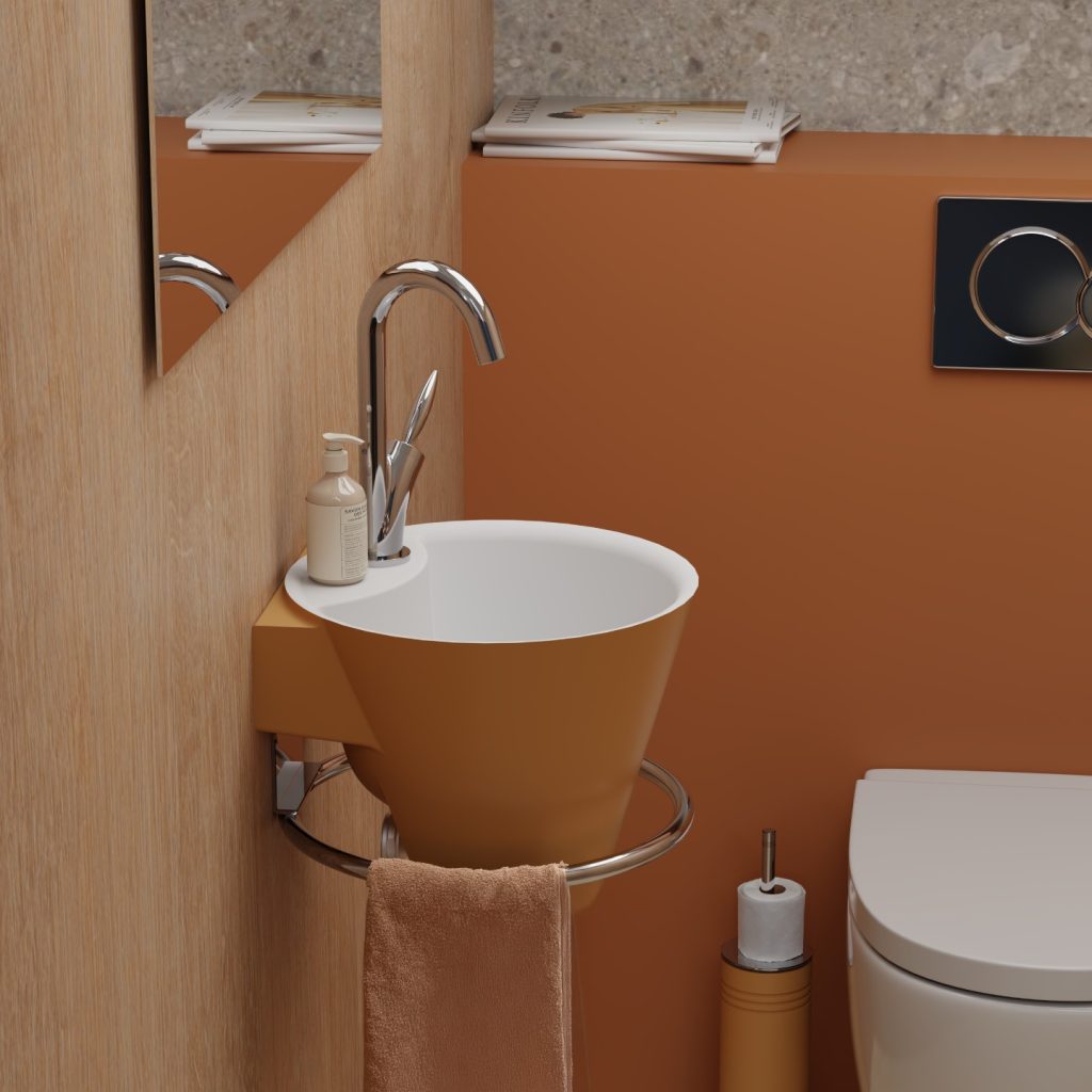 Das Handwaschbecken Cône charakterisiert mit seinem Design eine neue Konzeption. Die sichtbaren, sperrigen Anschlüsse und Accessoires werden verdeckt. Ein Design, das sich auf das Einfachste und Funktionellste konzentriert, profitiert davon.