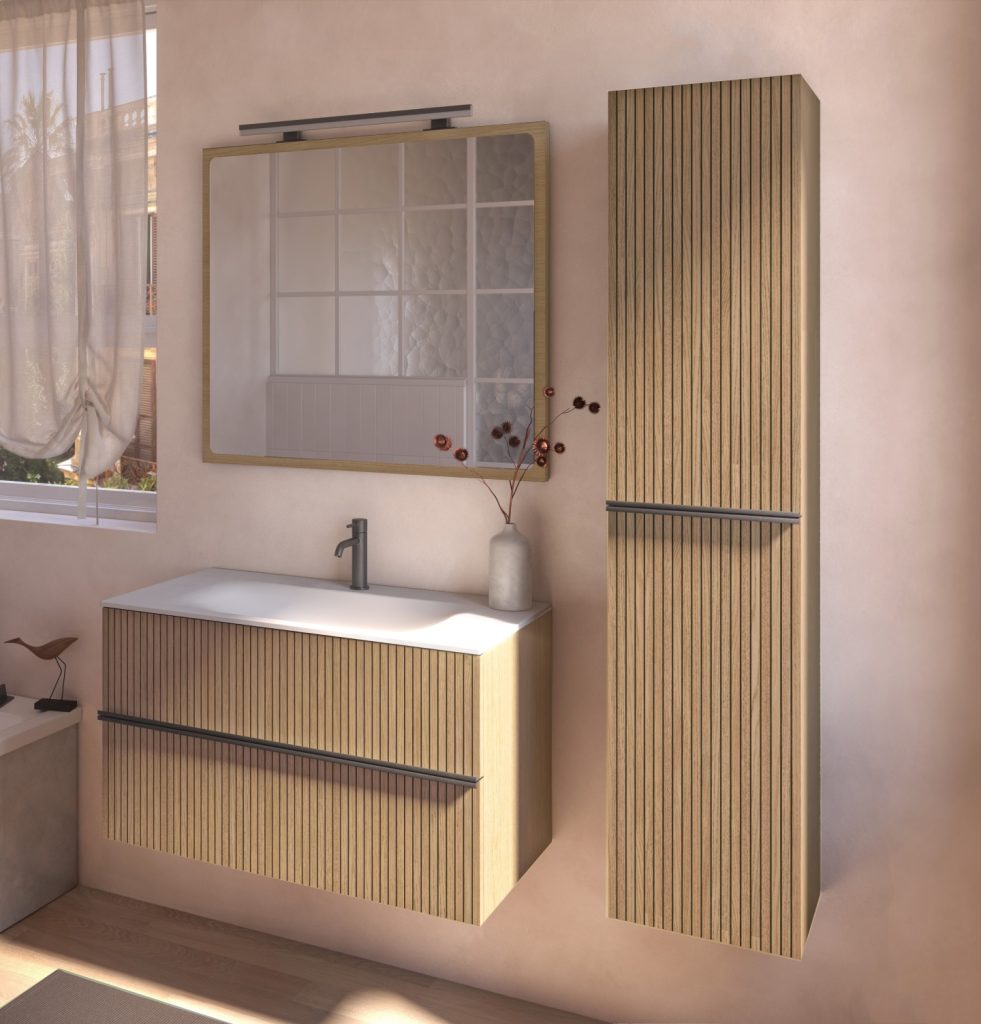 Der Waschtischunterschrank WOODY zeichnet sich durch seine moderne Interpretation von Holzarbeiten aus, die mit mattem Schwarz akzentuiert sind. Rhythmus und Textur stehen in warmer und einzigartiger Harmonie. Trendige Einzel- und Doppelwaschbecken.