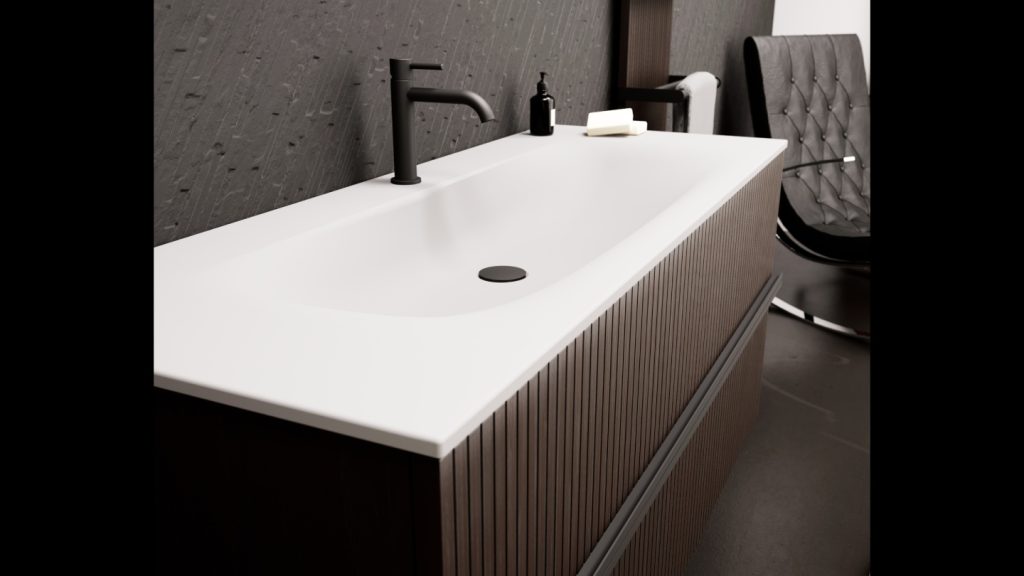 Eiche / Mineralwerkstoff oder Eiche / Keramik Carrara matt für eine behagliche und warme Atmosphäre.