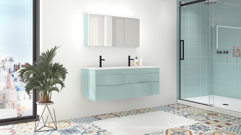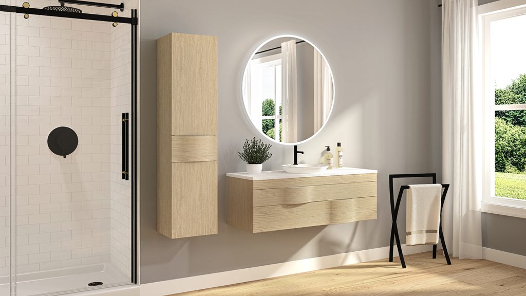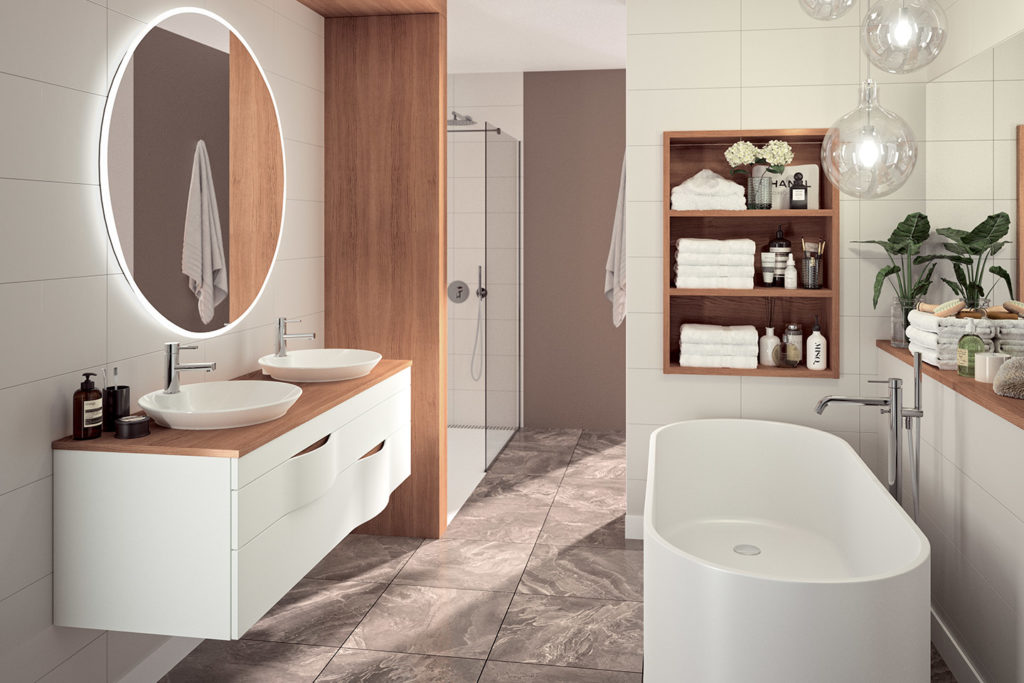 Die Illusion-Kollektion personalisiert Ihren Badezimmerraum mit großer Originalität. Die Innenausstattung der wunderschön gewellten Griffe in Rot, Beige oder Eiche verleiht Ihrer Badezimmereinrichtung Weichheit und Eleganz, begleitet von einem Hauch Sinnlichkeit. Der perfekt ausgeführte Schrank Illusion ist mit verschiedenen Beckenoberflächen, aus massiver Eiche oder Monoblock-Keramik in Hochglanzweiß, Solid Surface in Polarweiß, mit 2 oder 3 Schubladen, in 30 glänzenden oder matten Lacken und 2 Holzdekoren erhältlich.