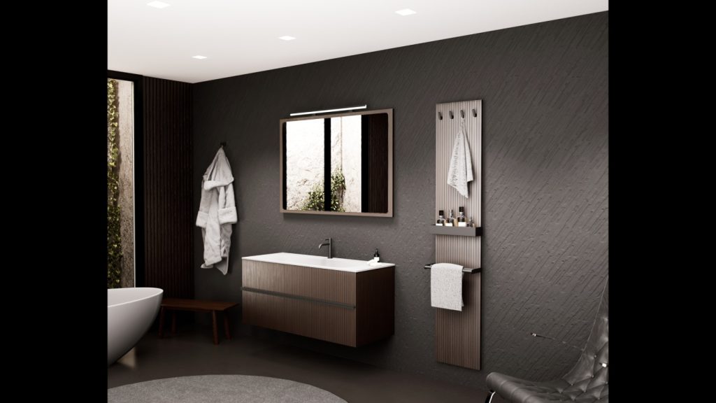 Der Waschtisch WOODY mit Eichenfurnier-Element und Scharnieren rechts oder links zeichnet sich durch seine moderne Neuinterpretation von Holzarbeiten aus, die mit mattem Schwarz akzentuiert sind. Rhythmus und Textur stehen in warmer und einzigartiger Harmonie.