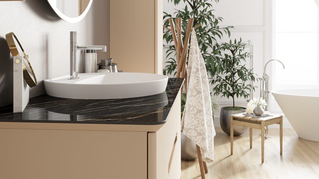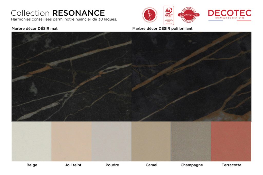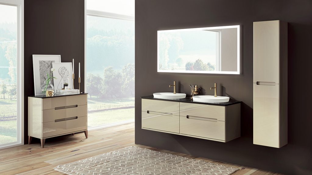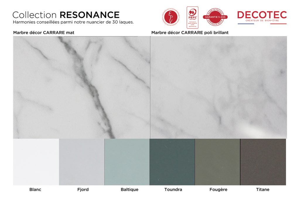 Zeitgemäß und elegant, der Materialmix aus Lack – matt oder glänzend, 60 Farbtöne – und Keramik mit Carrara-Dekor oder Désir-Dekor – matt oder glänzend – passend zu Ihrer Stimmung, weich und belebend, entspannend oder energetisierend.